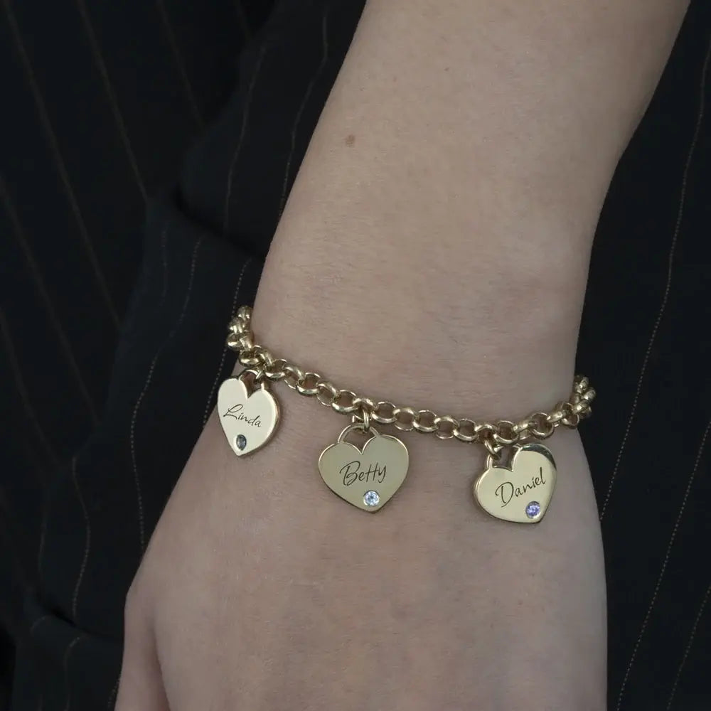 Personalized Perfection Tailor this piece to tell your family's story. With the ability to add up to 8 custom heart charms, this bracelet grows with your family. Each heart is precisely engraved in a graceful script and paired with a high-quality crystal that represents a birth month, creating a vibrant pop of color against the polished metal.